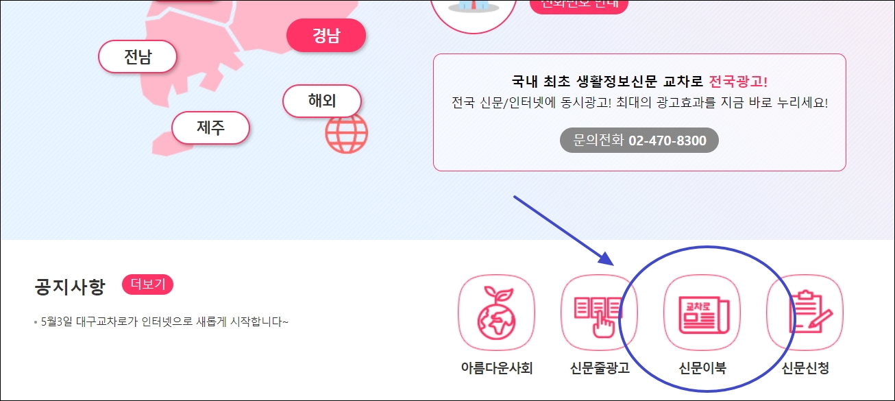 ▼교차로 사이트에 접속하면 가장 먼저 지도가 눈에 띌 겁니다. 여기서 홍성 지역을 선택해도 되기만, 종이 지면처럼 정보를 보고 싶은 경우에는 공지사항 옆에 있는 [신문이북]을 클릭합니다.