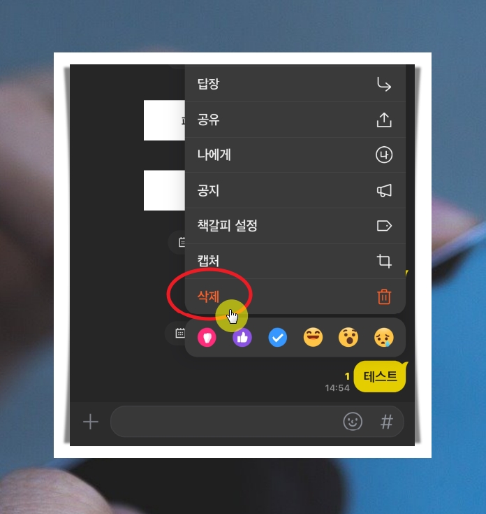 2. 메세지를 보낸 경우 다음과 같은 2가지 상황이 처하게 되는데요. 첫째, 상대방이 이 메세지를 확인하지 않은 상태, 둘째, 상대방이 이 메세지를 확인한 상태입니다. 확인을 한 상태라면 삭제하기를 할 필요가 없고, 첫째의 경우에만 해당 방법이 유효한데요. 보낸 내용을 손가락으로 꾸욱 눌러보세요. 그럼 여러 가지 메뉴가 나타납니다. 여기에서 가장 마지막에 있는 "삭제" 버튼을 눌러주세요.