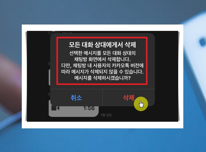4. 첫번째 삭제 버튼을 선택했더라도 위와 같은 이유로 일부 상황에서는 메세지가 제대로 지워지지 않을 수 있습니다. 가급적 카톡을 최신 버전으로 업데이트 해야겠네요. 물론 같은 채팅방 내 사용자들의 카톡도 업데이트가 되어야 겠지요.