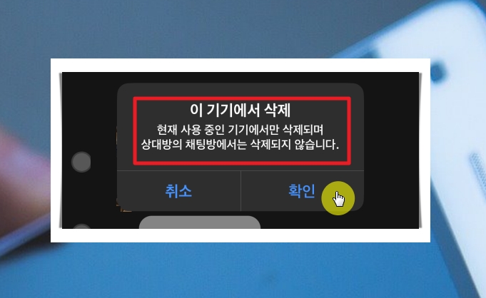 8. 화면에서 하단에 있는 삭제 버튼을 누르면 "이 기기에서 삭제"로 진행이 되는데요. 이유는 카톡을 보낸 시간이 5분을 넘겼기 때문입니다. 그러니까 가급적 5분 이내에 빨리 지워야 상대방이 내용 확인을 하지 않게 할 수 있어요.