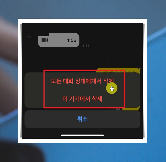 3. 해당 버튼을 누르면 모든 대화 상대에게서 메세지를 지우거나 이 기기에서만 지울 수 있는데요. 방금 실수로 보낸 메세지의 내용을 상대방이 읽지 않기를 바란다면 "모든 대화 상대에게서 삭제"를 선택하면 됩니다.