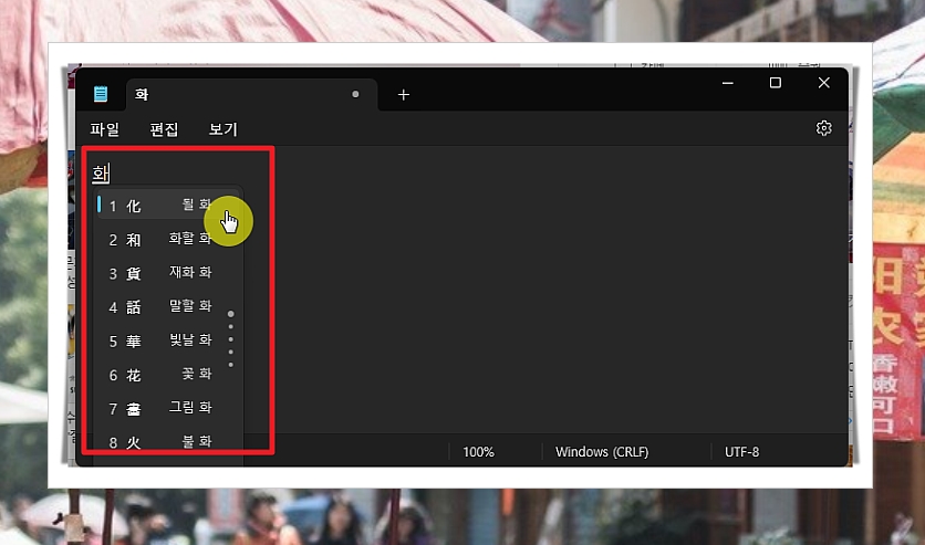1. 그럼 PC에서 기본으로 제공하는 기능을 이용하여 한글음에 대한 문자 바꾸기 진행을 해보도록 하겠습니다. 메모장, 인터넷 웹브라우저, 워드프로세서, 엑셀, 파워포인트 등 어디서나 사용이 가능한 방법입니다. 가장 간단한 메모장을 이용하여 한글을 한자로 바꾸어 보겠습니다. 방식은 간단합니다. 한글로 된 음을 하나 쓰고, 바로 이어서 키보드에 있는 "한자키"를 클릭해 보세요. 그럼 해당 음을 가진 한문이 여러 개 나타나는데요. 여기에서 바꾸려고 했던 문자를 선택하면 됩니다.