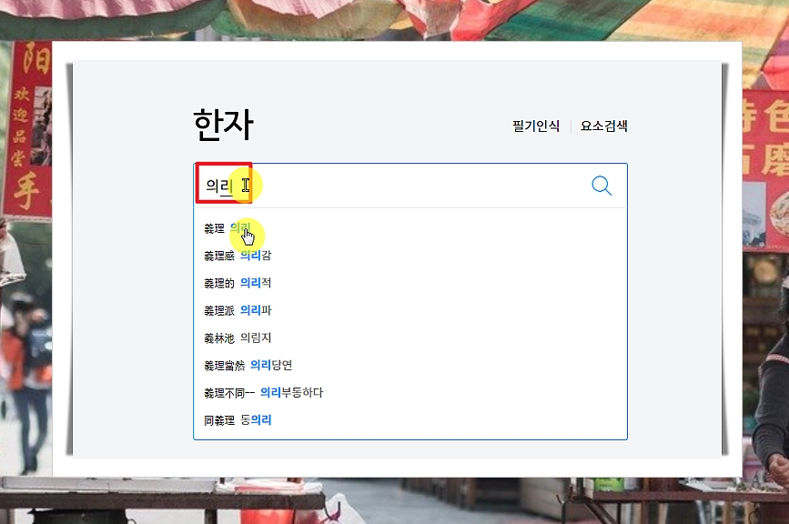 5. 한문사전 페이지가 열리면 검색창에 한글을 입력해 보세요. 하나의 한글 음만 입력해도 되고, 저처럼 한글 단어를 입력해도 됩니다. 하나의 글자 또는 하나의 단어만 입력해도 해당 키워드를 포함한 단어나 고사성어도 검색이 됩니다. 그렇기 때문에 4글자의 고사성어를 찾는다면 앞에 2개의 한자의 음만 한글로 입력해도 돼요. 그래도 자동완성 기능을 통해 쉽게 찾을 수 있어요.