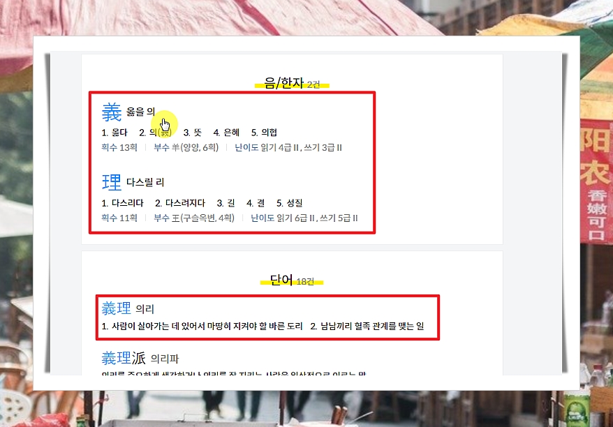 6. 저는 "의리"를 검색했는데요. 이에 따라 "義理"라는 단어와 함께 해당 단어를 구성하고 있는 한자를 찾을 수 있었습니다. 관련 단어도 18건이나 나타나네요. 여기서 단어의 뜻은 자세히 볼 수 있으니 한자를 선택해 보도록 하겠습니다.
