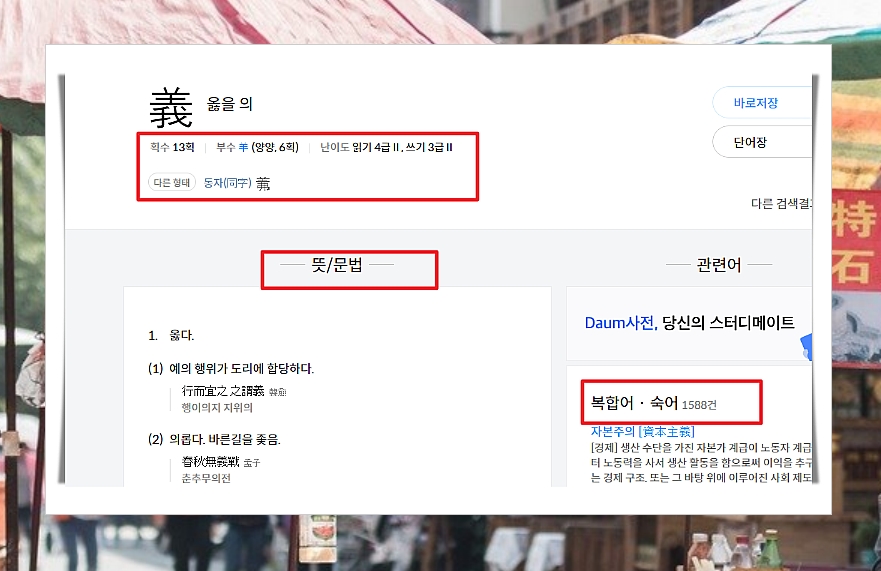7. "옳을 의"를 선택했는데요. 전용 페이지가 열리면서 획수, 부수, 난이도, 뜻, 문법, 복합어, 숙어를 알아볼 수 있었습니다. 한문 학습을 하기에 정말 좋아요.