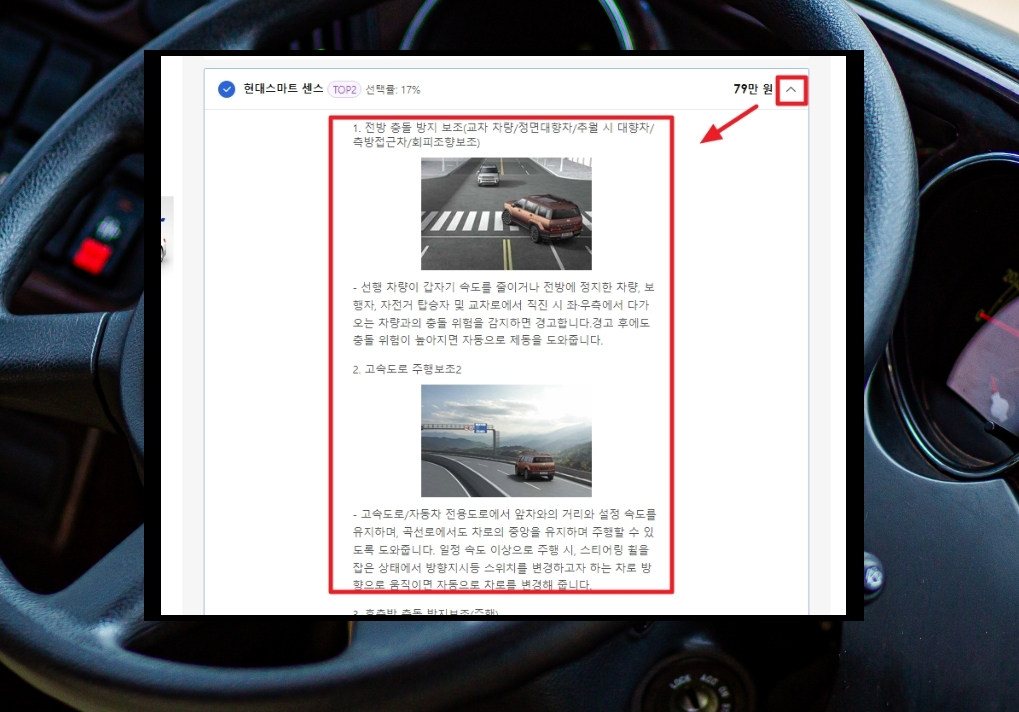 8. 옵션 가격표 옆에 있는 버튼을 클릭하면 이렇게 현대의 옵션에 대한 설명을 볼 수 있습니다. 현대스마트 센스의 경우에는 이전 단계에서 제가 언급한 주행보조 기능을 제공하고 있네요.