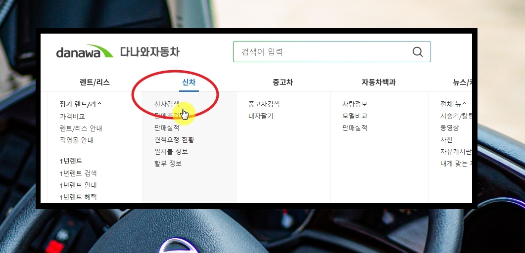 3. 다나와 사이트에 접속하면 메뉴에서 [신차 검색]을 선택해 주세요. 전체 메뉴를 보면 아시겠지만, 렌트, 리스, 중고 매물에 대한 것도 알아볼 수 있습니다.