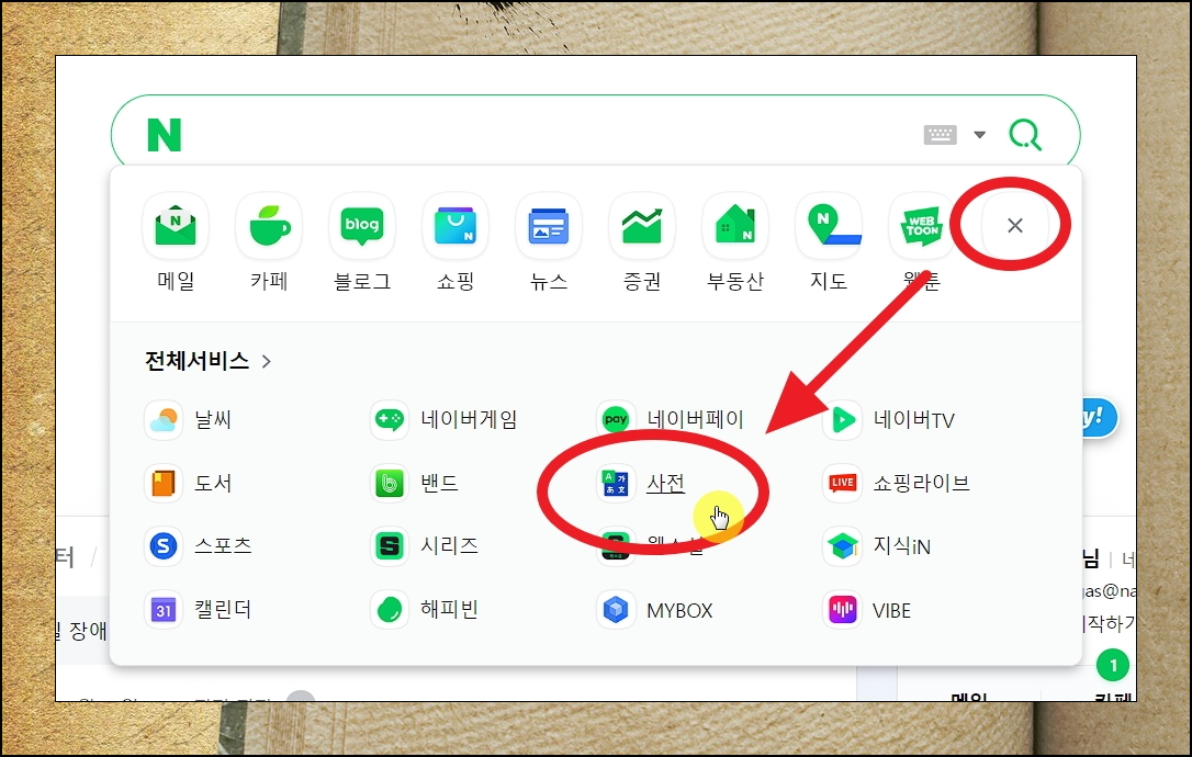 요즘에는 온라인 사전 서비스가 대세입니다. 이러한 서비스를 통해 외국어는 물론이고, 한자에 대해 풍부한 지식을 검색하거나 쌓을 수 있는데요. 이를 통해 효과적인 한문찾기 방법을 진행해 보세요. 해당 방법을 진행하기 위해서는 네이버 메인 화면에 있는 메뉴 중에서 전체 서비스에 있는 사전을 선택하면 됩니다.