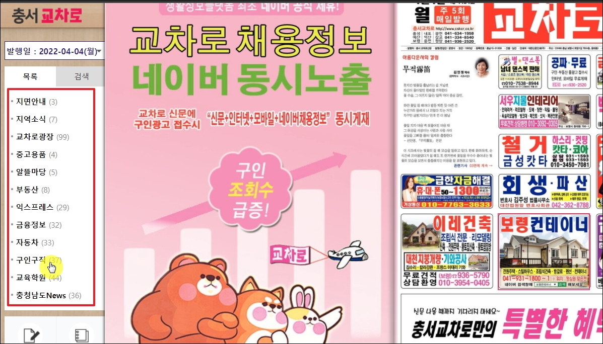 ▼4월 4일에 나올 교차로 신문에 대한 이북을 열어보았습니다. 좌측에 보면 목록이 있습니다. 여기에서 원하는 정보를 선택하면 됩니다. 지역소식, 교차로 광장, 중고용품, 알뜰마당, 부동산, 자동차, 구인구직, 충청남도 뉴스 등 여러 가지 정보가 마련되어 있습니다.