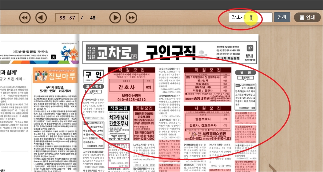 ▼저는 구인구직을 선택해 보았습니다. 홍성 교차로 신문 이북의 지면을 보면 글씨가 작아서 보기 어려울 수 있습니다. 이런 경우 지면을 마우스로 클릭하면 내용이 확대가 됩니다. 줄광고나 박스광고를 신청할 수 있는 버튼도 마련되어 있으니 필요할 때 사용해 보시길 바랍니다.
