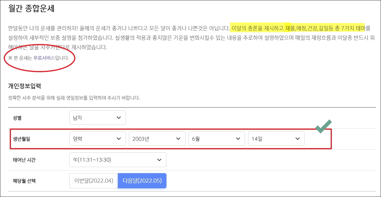 ▼해당 역술 서비스를 이용하려면 생년월일을 포함한 태어난 시각, 성별 입력은 필수입니다. 보고 싶은 달을 선택함으로써 이번 달은 물론이고, 다음달 운세까지 볼 수 있습니다.