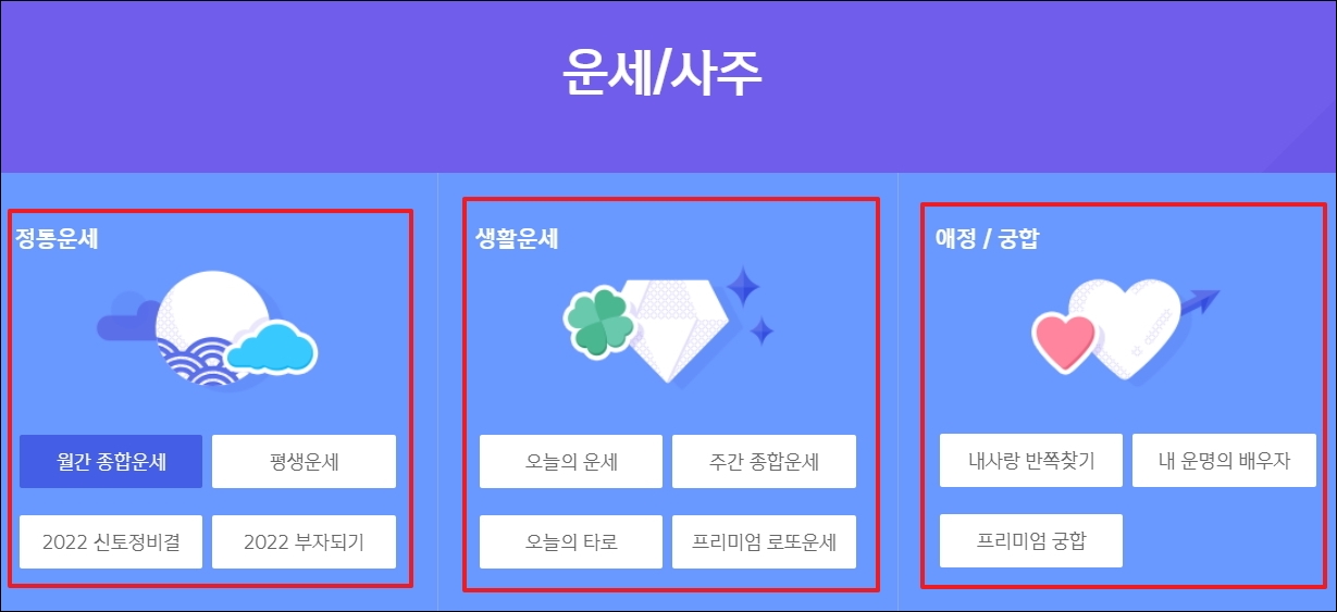 ▼제가 주로 이용한 무료 사주 사이트에서는 생년월일을 기반으로 평생, 2022년 한해, 월간, 주간, 일간에 대한 운세를 볼 수 있습니다. 여기에 더하여 타로 카드점과 같이 생년월일 입력 없이 볼 수 있는 역술 서비스도 있죠.