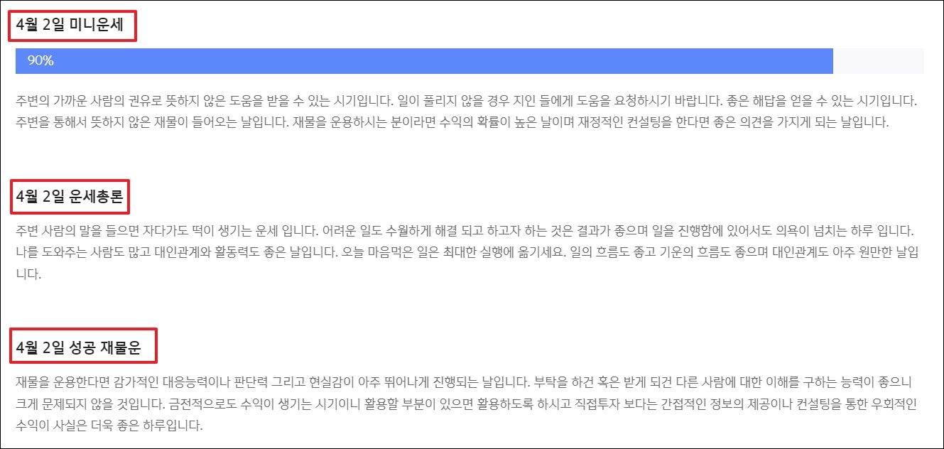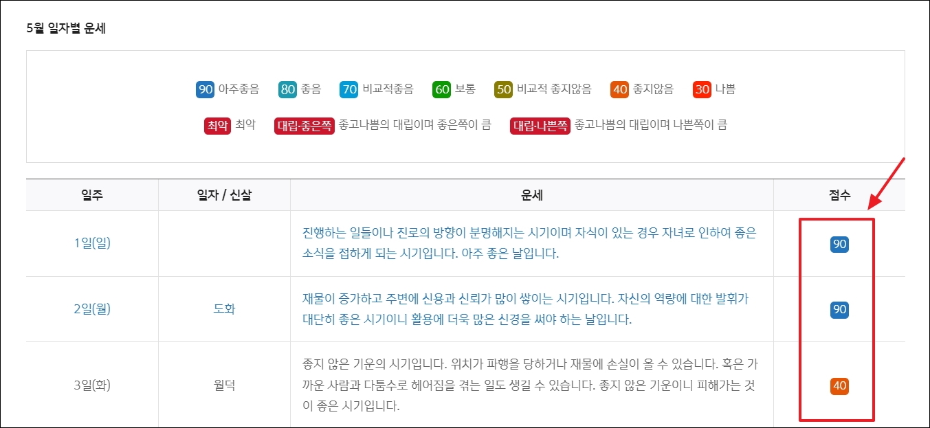 ▼일자별 운세 풀이도 여기에 나옵니다. 매일마다 어떤 운이 들어오고, 무엇을 조심해야 되며 어떻게 살아가면 좋은지 알려줍니다. 점수를 통해 그날의 행운도를 파악하는 것도 가능합니다.