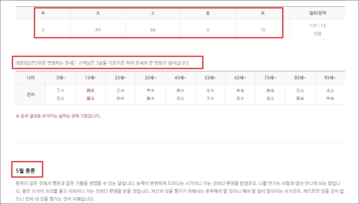 ▼결과가 나왔습니다. 가장 먼저 사주명식, 오행, 대운이 나옵니다. 사주 공부를 한 사람이 아니라면 어떤 의미인지 파악하기 어렵습니다. 그냥 오행 정도만 보고, 그 다음 나오는 해석을 보면 됩니다. 5월 총론을 통해 다음 달 나의 운세가 어떠한지 자세히 살펴볼 수 있습니다.