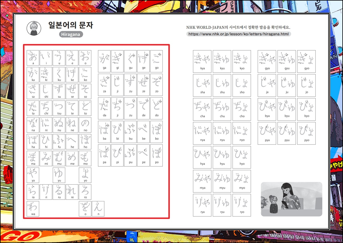 앞서 살펴본 히라가나 가타카나 표는 일본말 첫걸음 사이트에서 이용할 수 있습니다. 이곳에서는 인쇄하여 쓰기 자료로 쓸 수 있는 문서 파일도 제공하고 있어요. NHK에서 운영하는 곳인데요, 별다른 교재 없이 일본어를 배우고 싶을 때 매우 유용한 곳입니다.