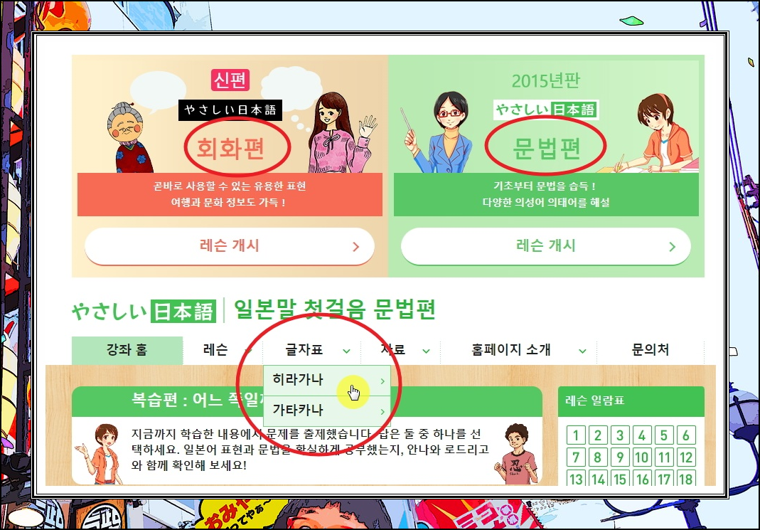 일본말 첫걸음 사이트에 접속했습니다. 회화, 문법 등 여러 가지 레슨이 나타나는데요, 일단 글자표 메뉴를 선택해 주세요. 그럼 히라가나와 가타카나를 선택할 수 있게 하위 메뉴가 나타납니다.