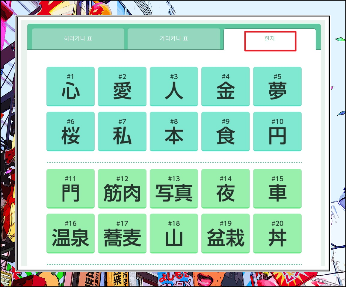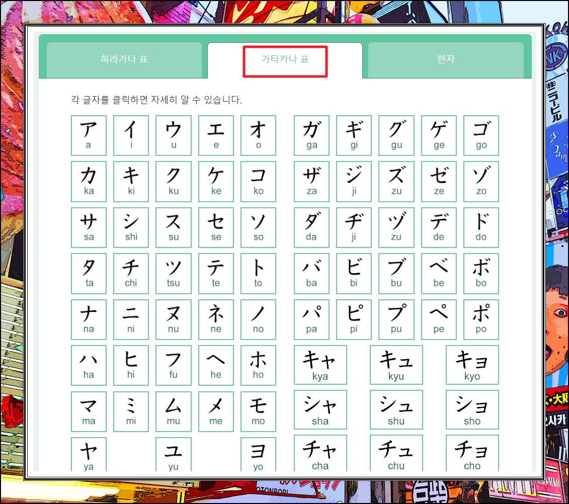 다음과 같이 한 눈에 볼 수 있도록 정리되어 있는 일본어 문자 표가 있습니다. 히라가나와 가타카나를 익히는데 매우 유용한데요, 많이 쓰이는 한자 또한 이것을 통해서 표로 볼 수 있습니다. 추가로 여기에 있는 문자를 마우스로 클릭하면 발음을 들을 수 있습니다. 다국어를 배울 때에는 정확한 발음을 익히는 것이 꽤 중요해요.