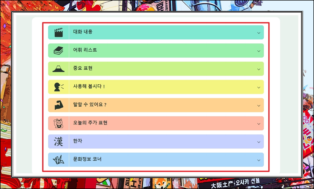 영상 자료 외에도 해당 회화에 관련하여 내용, 어휘 리스트, 중요 표현, 사용 예시, 추가 표현, 한자, 문화 정보와 같은 여러 가지 추가 컨텐츠를 제공하고 있습니다.