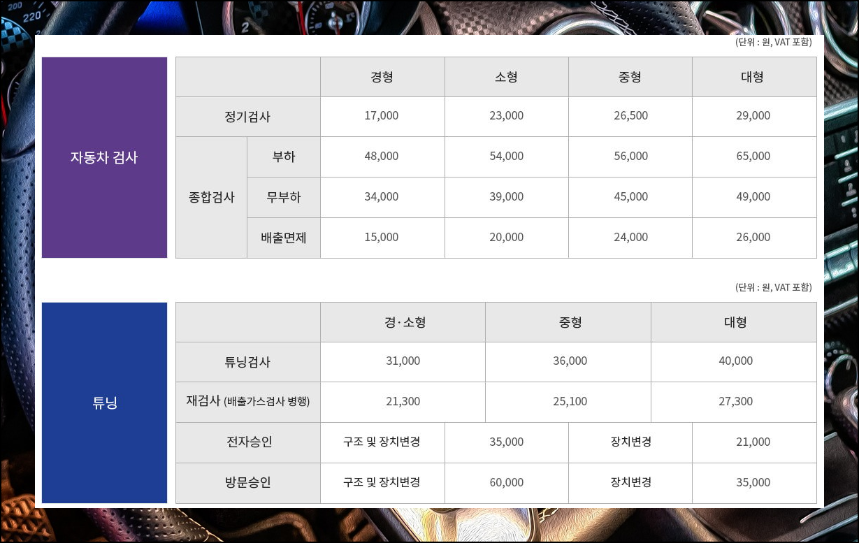 경형, 소형, 중형, 대형 이렇게 차량 종류에 따라 일부 비용이 달라질 수 있습니다. 운행차소음 확인 및 택시미터 사용검정, 경사각도 측정 등은 동일하고요.