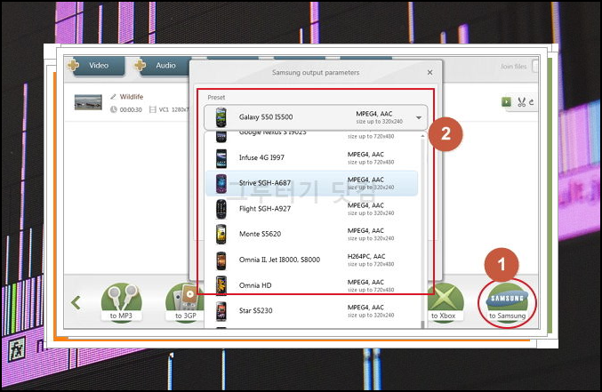 번호 순서대로 누르시면 쉽게 변환하실 수 있는데요. ③번은 동영상 자르기 및 붙이기 기능이고, ④번은 변환할 포맷들입니다. 양쪽 화살표를 눌러보시면 꽤 많은 포멧들이 나온답니다. (Xbox, 삼성폰, FLV, 블랙베리, 노키아 등 다양합니다.)