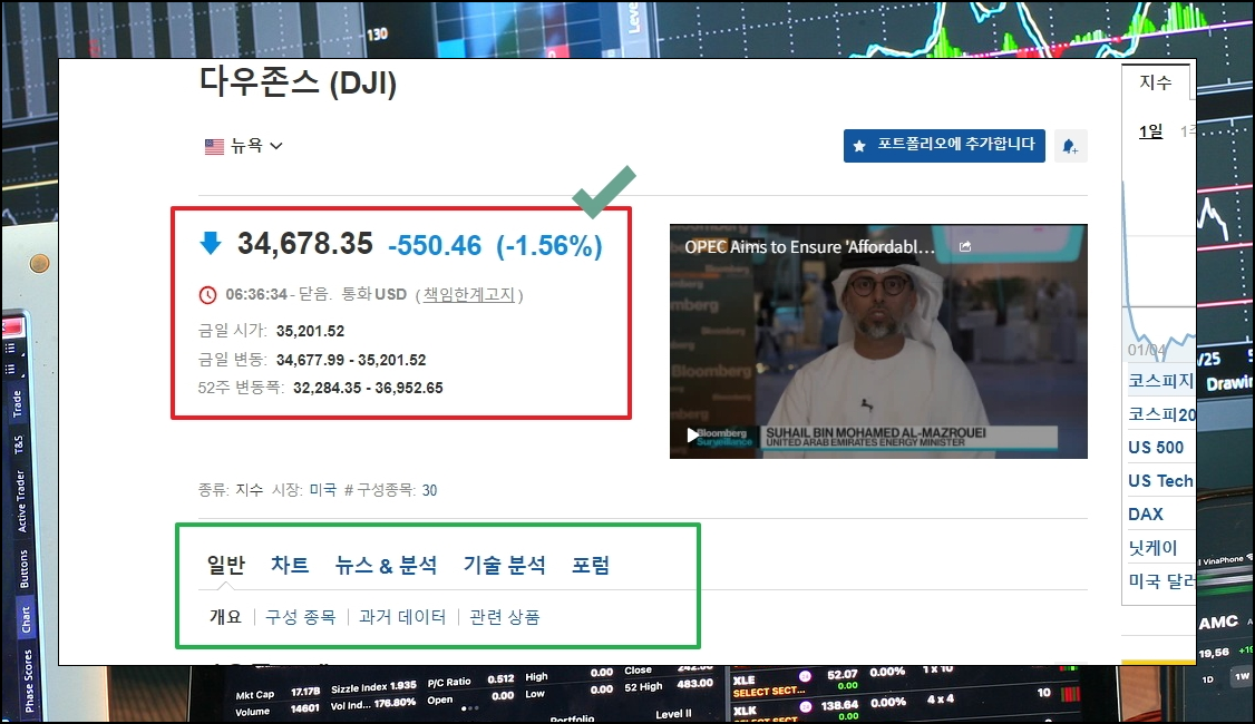 좀 더 자세한 정보를 얻기 위해 표에서 다우존스를 클릭했습니다. 시간이 흐름에 따라 즉시 반영되는 오늘의 다우존스 지표가 가장 위에 나타납니다. 바로 아래에는 다우존스에 관련된 여러 가지 정보와 서비스를 이용할 수 있도록 메뉴가 마련되어 있습니다.