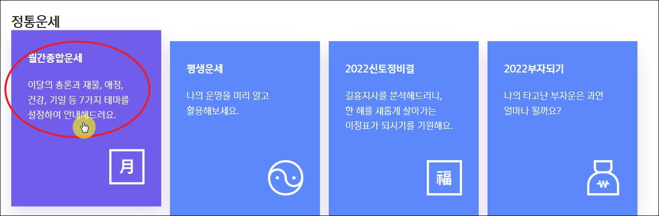 ▼이곳에서 가장 이용하기 좋은 것 몇 가지를 알려드리겠습니다. 월마다 자주 운세나 사주를 보는 경우에는 [월간종합운세] 서비스를 추천 합니다. 이달의 총론, 재물, 애정, 건강, 기일 등 다양하게 볼 수 있죠.