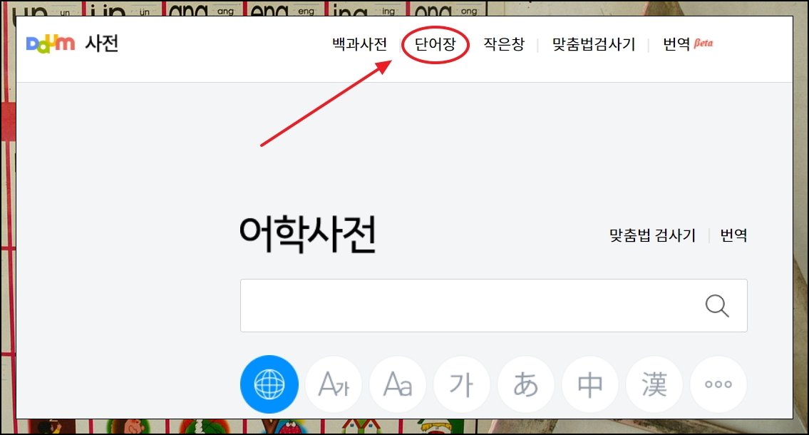 다음 사전 사이트에 접속했습니다. 홈페이지 상단에 있는 [단어장] 메뉴를 클릭합니다. 참고로 이곳에서는 한글, 일본어, 중국어, 한자 등에 대한 사전 서비스를 제공하고 있습니다.
