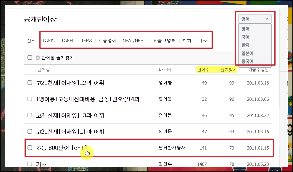 공개 단어장 페이지가 열렸습니다. 우측 상단에 보면 국어, 한자, 일본어, 중국어로 된 자료도 선택할 수 있습니다. 초등 외에도 토익, 토플, 텝스, 수능, NEAT, NEPT, 중학교, 고등학교, 회화용으로 쓰이는 영어단어 1000개 이상 모음을 만나볼 수 있습니다. 이 중에서 초등 영어단어를 선택해 보겠습니다. 즐겨찾기 횟수가 표시되어 있기 때문에 이를 참고하여 고르면 됩니다.