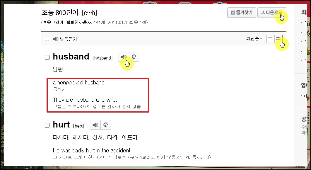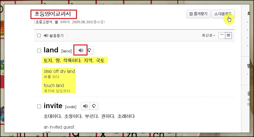 제가 이용하는 사전 서비스를 이용하면 다음과 같이 초등 학습에 도움이 되는 단어장을 이용할 수 있습니다. 스피커 모양의 아이콘을 클릭하면 발음을 들어볼 수 있고, 예문도 있어서 공부하기에 정말 좋습니다. 인터넷 상에서만 영어단어를 보는 것이 아니고, 파일로 다운로드 받는 것도 가능합니다.