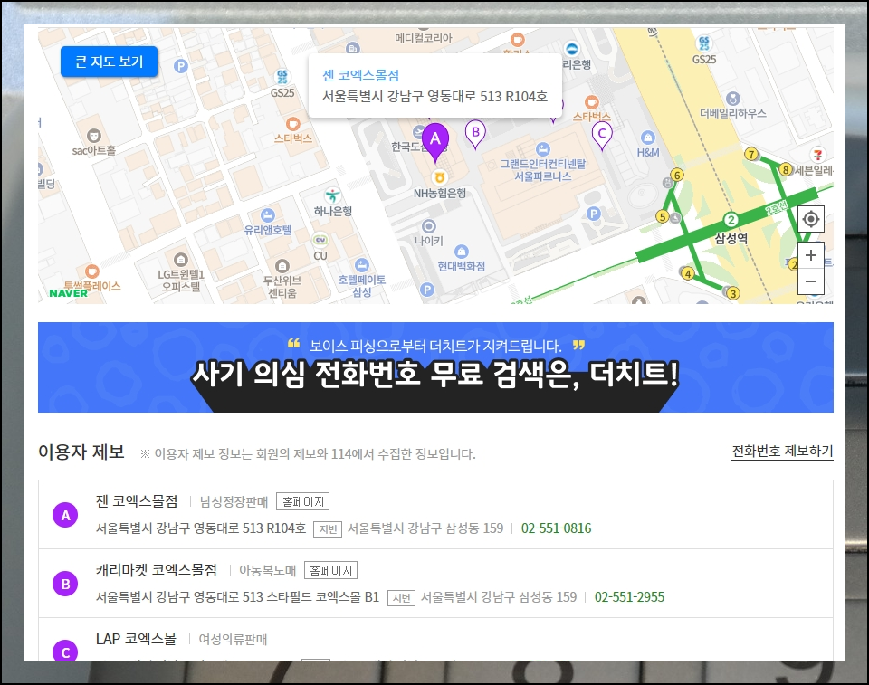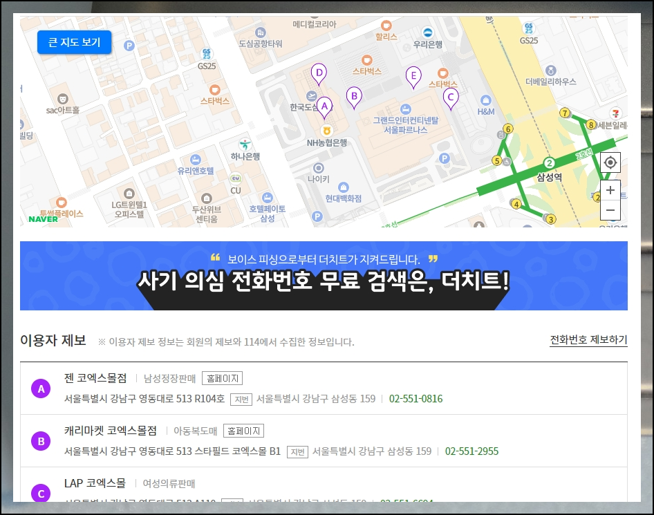 두 번째로 이용하는 서비스는 전화번호 찾기에 특화된 곳이라고 할 수 있습니다. 주소로 검색하는 것도 가능하지만, 상호명이나 기관명을 입력해도 알 수 있죠. 더 나아가 스팸, 공중전화 위치, 지역코드 찾기 등의 서비스도 함께 제공하고 있습니다.