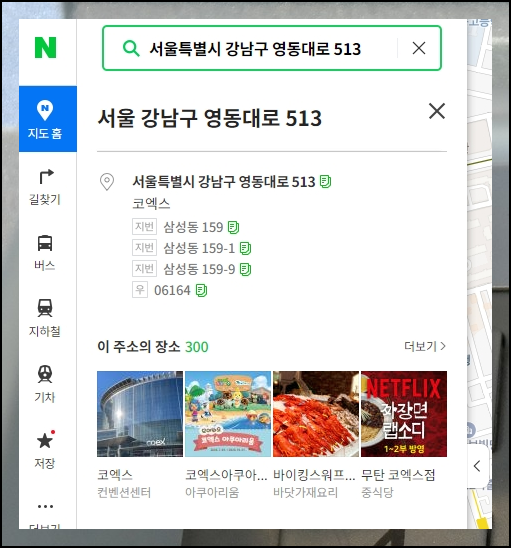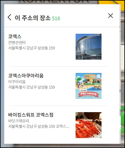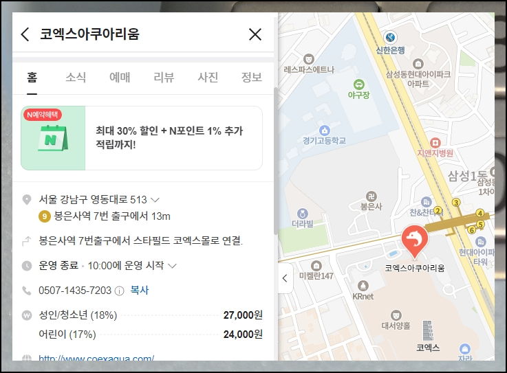 같은 주소로 되어 있는 장소가 518개나 될 정도로 많은 시설이 밀집된 곳인데요. 저는 사람들이 많이 찾는 코엑스 아쿠아리움을 선택했는데요. 전화번호를 쉽게 알아내기 가능했습니다. 여기에 더하여 운영시간과 이용할 때 내야 하는 요금 정보도 함께 알 수 있었어요.