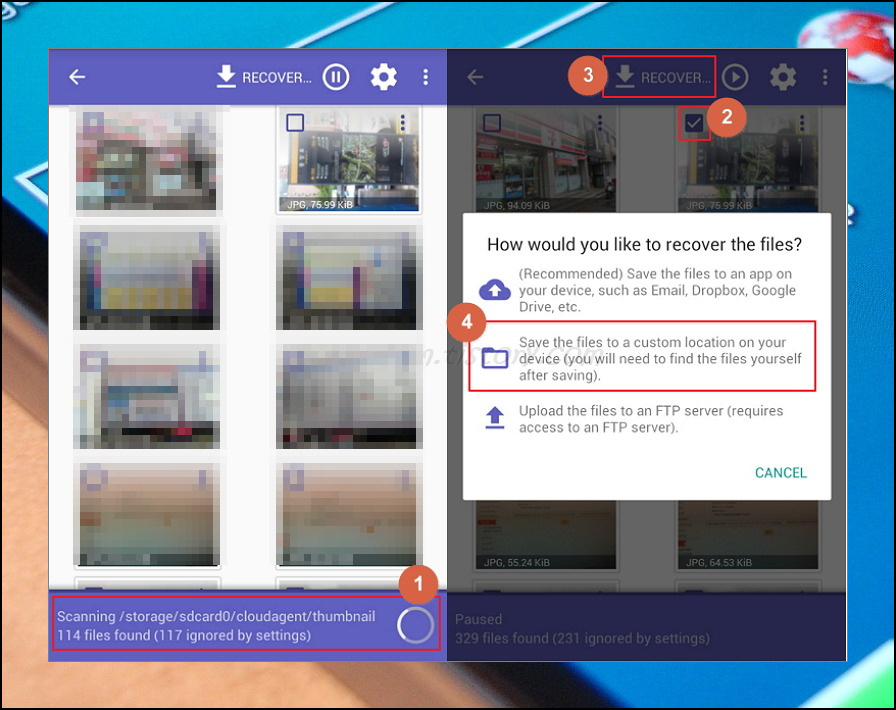 스캔이 되면 삭제했던 파일이 보이는데요. 번호 순서대로 되살리고 싶은 사진을 체크한 후(②) 상단에 있는 Recover 버튼(③)을 눌러주세요. 그럼 복원할 사진을 저장할 곳을 선택하라고 나오는데요. 첫번째는 드랍박스나 구글드라이브와 같은 인터넷 저장소를 말하는거고요. 두번째는 해당 기기 안의 저장소를 말한답니다. 간단하게 기기 안의 저장소를 선택해볼게요.