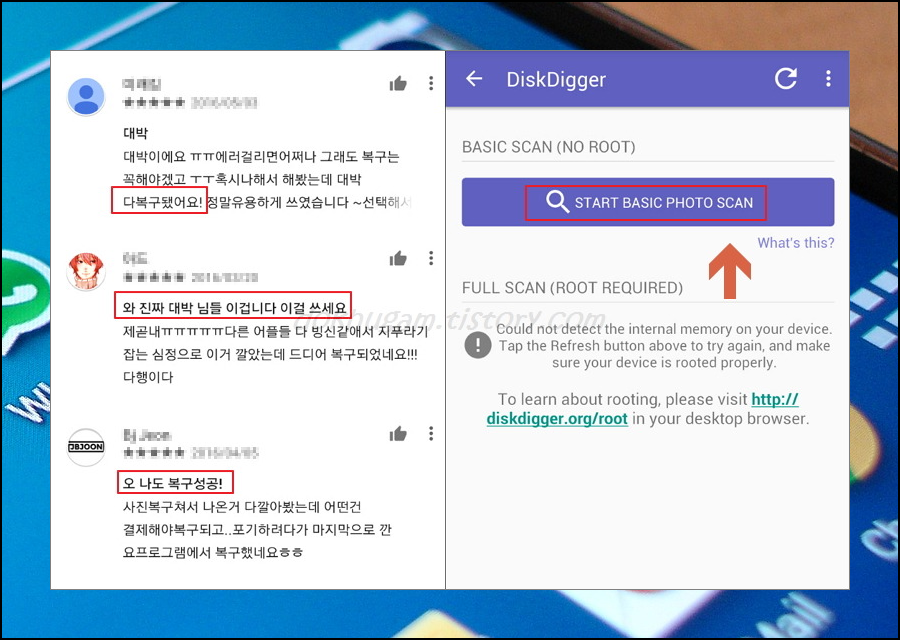리뷰를 한번 보세요. 최근 2016년 3~5월에 등록된 리뷰들인데요. 이용해본 사람들이 스마트폰 사진 복원 결과에 대해 흡족해 하는 모습을 확인해보실 수 있습니다. 직접 어플을 설치하면서 리뷰 한번 확인해보세요. 어플 설치가 완료되었으면 어플을 실행하신 후 'Start Basic Photo Scan'을 눌러주시길 바랍니다.