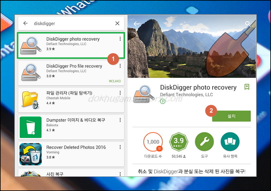 구글 앱스토어에서 'diskdigger'를 검색해주세요. 스마트폰에서 삭제된 사진을 복구하는 어플인데요. Pro 버전도 있지만, 굳이 Pro 버전을 사용할 필요가 없답니다. 왜냐하면 이미지 파일에 대한 복원은 무료 버전에서도 가능하기 때문입니다.