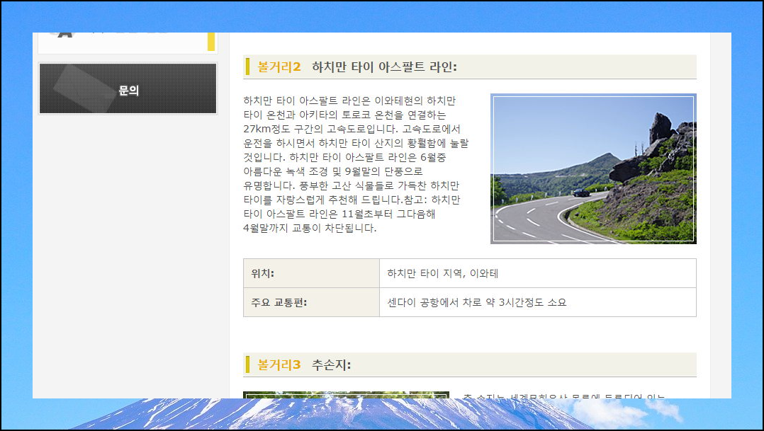 볼거리2를 클릭하니 하치만 타이 아스팔트 라인에 대한 관광 안내를 볼 수 있는데요. 아름다운 자연경관을 만끽할 수 있는 곳으로 보입니다. 위치와 주요 교통편이 나와 있어서 쉽게 찾아 갈 수 있어요.