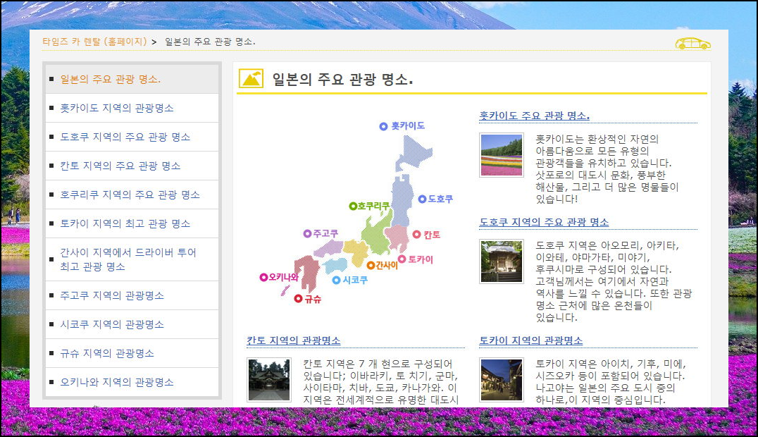 우리나라 관광지는 우리나라 사람이 잘 알듯이 일본 관광지는 일본 사람이 잘 알겠죠? 일본 회사인 타임즈 카 렌탈의 홈페이지에서 여러 관광지에 대한 정보를 얻을 수 있습니다.