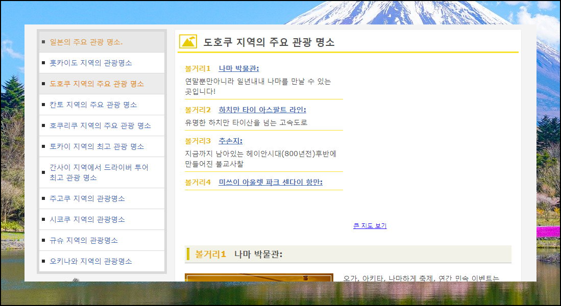 훗카이도, 도호쿠, 호루리쿠, 칸토, 토카이, 간사이, 주고쿠, 시코쿠, 규슈, 오키나와 지역의 유명 관광명소를 알아볼 수 있는데요. 우리에게 생소한 도호쿠 지역의 주요 관광 명소를 클릭해 보겠습니다.