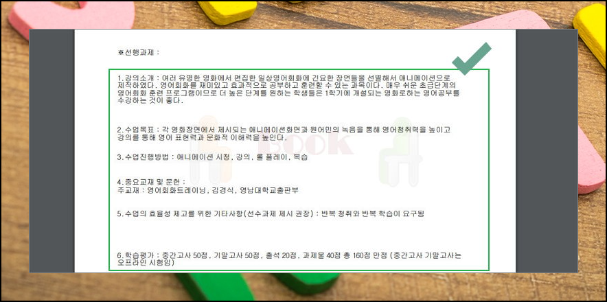 강좌를 선택할 때 참고할 수 있는 소개 내용, 수업 목표, 수업 진행 방법, 중요교제 및 문헌 등을 참고해 보세요. 보통 공부 잘하는 학생의 경우 수업 목표를 제대로 인지한 후 영어공부에 임하는 경향이 있어요. 사소하지만 이러한 학습 태도를 본받는다면 영어 실력을 키우는 데에 도움이 될 거에요.
