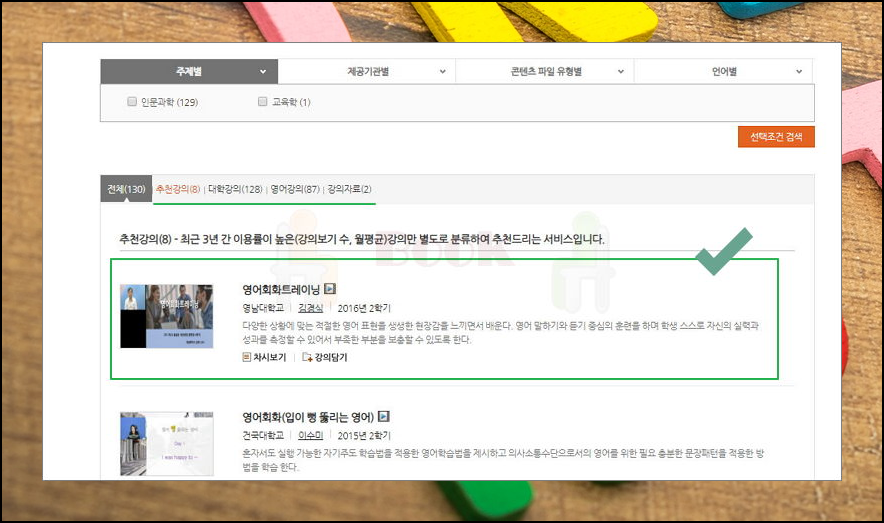 영어회화에 관련된 강의만 130건이나 되네요. 기초에서 고급까지 다양한 강좌가 있는데요. kocw를 통해 강의를 듣는 방법은 어렵지 않아요. 마음에 드는 강좌를 클릭하기만 하면 돼요.