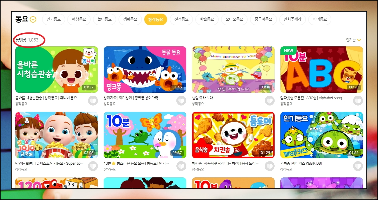 요즘 아이들에게 인기가 있는 신나는 동요는 무엇이 있을까요? 최신 업데이트 정보를 보았을때 상어가족, 곰 세마리, 콩순이 응가송, 생일 축하 노래, ABC송, 맛있는 팝콘이 1위에서 6위를 차지하고 있네요. 어른들도 그렇지만, 아이들에게 만화 케릭터는 친숙한 친구인데요. 그렇기 때문에 같은 곡이라도 자신이 좋아하는 만화 케릭터가 나온 것을 더 좋아합니다.