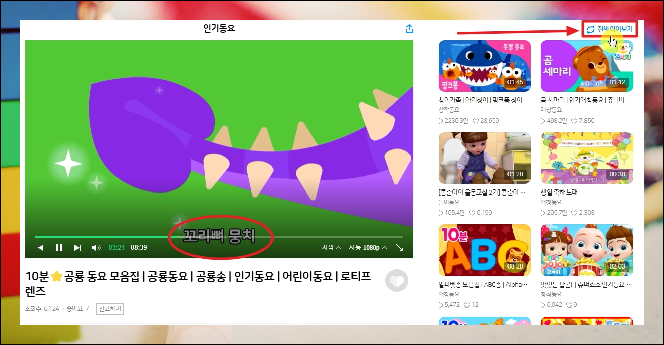 저는 아이들이 좋아하는 공룡 동요 모음집을 선택했는데요. 10분 정도 되는 플레이 시간을 갖고 있습니다. 사이트 화면에 보면 우측 상단에 [전체 이어보기] 버튼이 있는데요. 해당 버튼을 누르면 지금 듣고 있는 곡의 재생이 끝나면 바로 이어서 다른 동요듣기 컨텐츠를 연속으로 재생할 수 있습니다. 여기 있는 컨텐츠 모두 무료 듣기 가능하니까 부담 없이 마음껏 이용해 보세요.