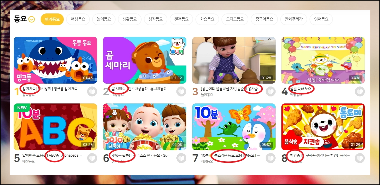 요즘 아이들에게 인기가 있는 신나는 동요는 무엇이 있을까요? 최신 업데이트 정보를 보았을때 상어가족, 곰 세마리, 콩순이 응가송, 생일 축하 노래, ABC송, 맛있는 팝콘이 1위에서 6위를 차지하고 있네요. 어른들도 그렇지만, 아이들에게 만화 케릭터는 친숙한 친구인데요. 그렇기 때문에 같은 곡이라도 자신이 좋아하는 만화 케릭터가 나온 것을 더 좋아합니다.