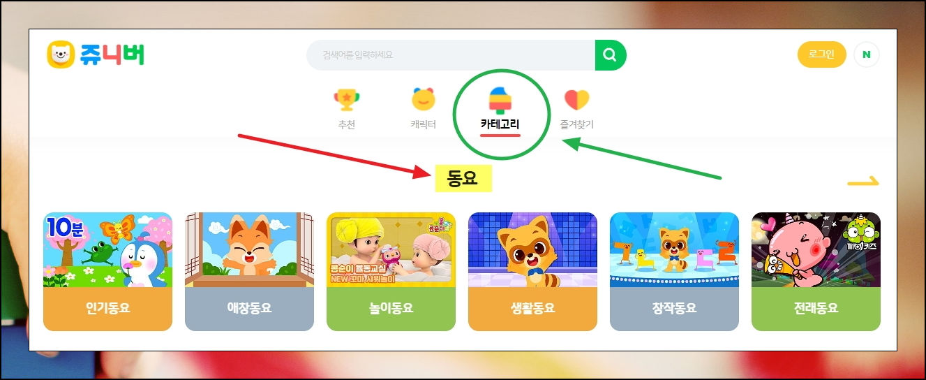 쥬니버 사이트에 접속하면 어린이용 컨텐츠가 많이 나와요. 동화나 키즈 엔터테인먼트와 같이 재미있는 것들이 풍부하죠. 이번 시간에는 신나는 동요듣기 컨텐츠를 이용하려고 하는데요. 이를 위해서는 사이트 화면 중앙 상단에 있는 [카테고리]를 선택해야 합니다. 여러 가지 노래 종류를 찾을 수 있어요.
