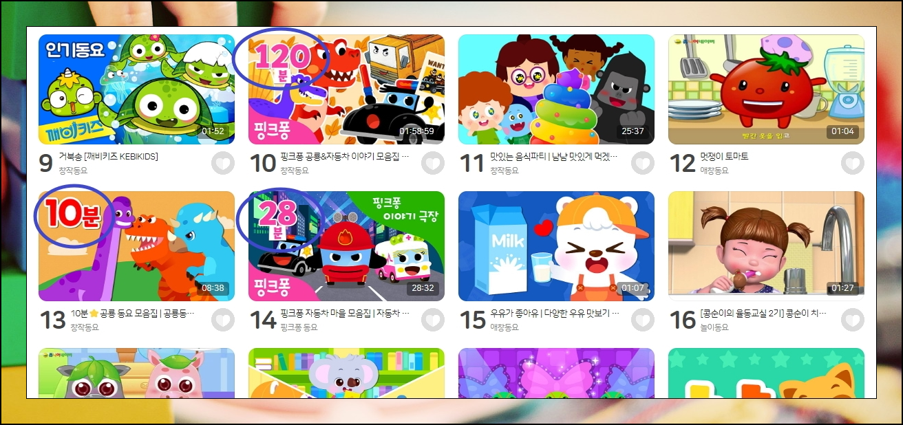 연속으로 동요듣기 하고 싶을 때에는 10분, 28분, 120분 이렇게 시간 단위로 묶여 있는 노래 모음집을 선택해 보세요. 그럼 시간을 정해서 연속으로 재생을 할 수 있어요. 물론 이러한 모음집을 선택하지 않아도 모든 곡에 대하여 전체적으로 연속으로 듣는 것이 가능합니다.