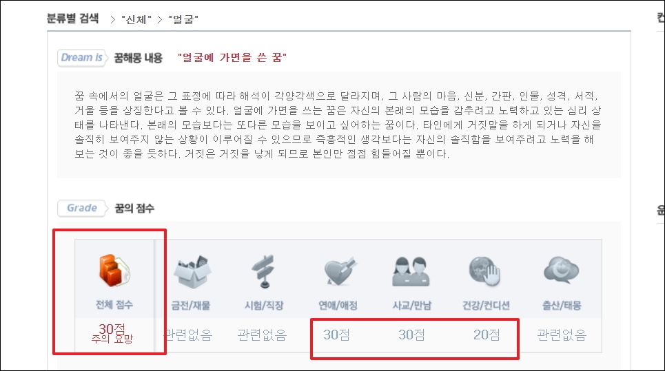 ▼꿈풀이 결과는 크게 2가지로 나뉩니다. 첫 째는 자세한 해몽 내용입니다. 얼굴의 경우에는 그 표정에 따라 해석이 각양각색 달라지기 때문에 조금 풀이하기 어렵다고 합니다. 얼굴은 마음, 신분, 간판, 인물, 성격, 거울 등을 상징하다고 할 수 있다고 하죠. 얼굴에 가면을 쓴 꿈의 경우에는 점수가 30점으로 주의를 요망한다고 합니다. 일상 생활을 함에 있어서 좀 더 조심해야 할 필요가 있다고 판단됩니다. 특히 연애, 애정, 사교, 만남, 건강, 컨디션 부분에 있어서 조심해야 할 듯 합니다.