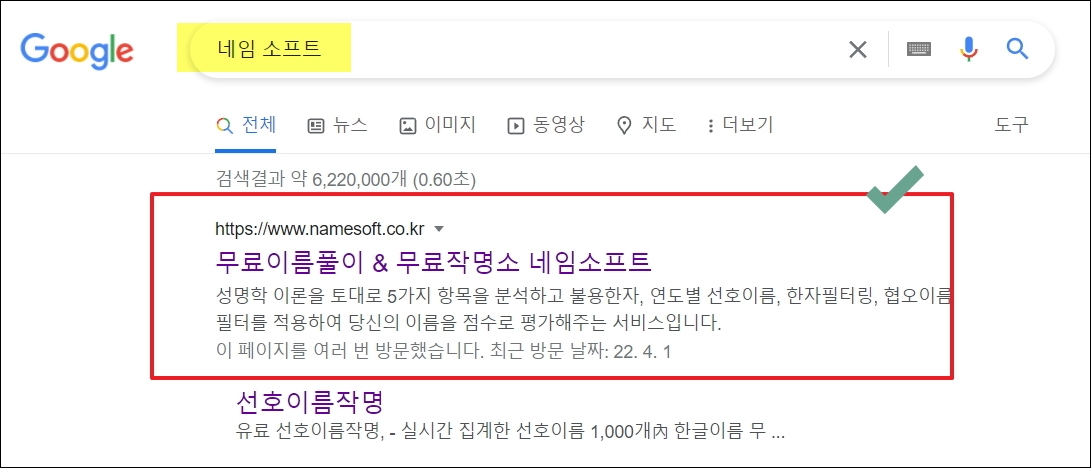 ▼제가 방금 보여 드린 결과물은 네임 소프트 홈페이지에서 이용한 것입니다. 이곳에서는 무료 성명풀이와 무료 작명을 할 수 있는 곳이죠. 성명학 이론을 토대로 5가지 항목을 분석한다고 합니다. 불용한자를 필터링 해주기 때문에 마음 놓고 사용하기에 정말 좋습니다.