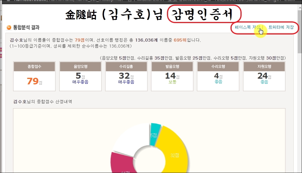 ▼감명인증서에는 해당 이름에 대한 선호도 랭킹과 종합점수가 나타납니다. 페이스북이나 트위터에 저장도 가능합니다.