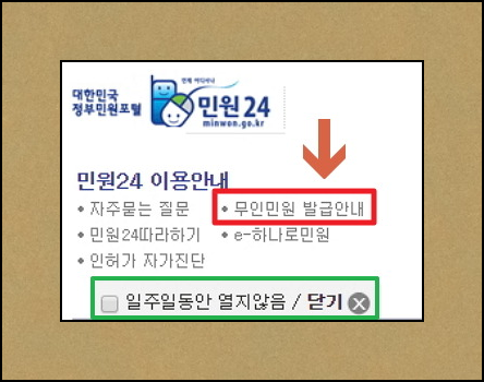 사이트를 접속하시면 맨 오른쪽 위에 "무인민원 발급안내"라고 적혀 있는데요. 클릭해주세요. 잘못해서 녹색 박스에 있는 [일주일동안 열지않음 / 닫기]를 눌르시면 안됩니다. 왜냐하면 이 창이 아니면 "무인민원 발급안내" 버튼 찾기가 어려워요. -_-;;