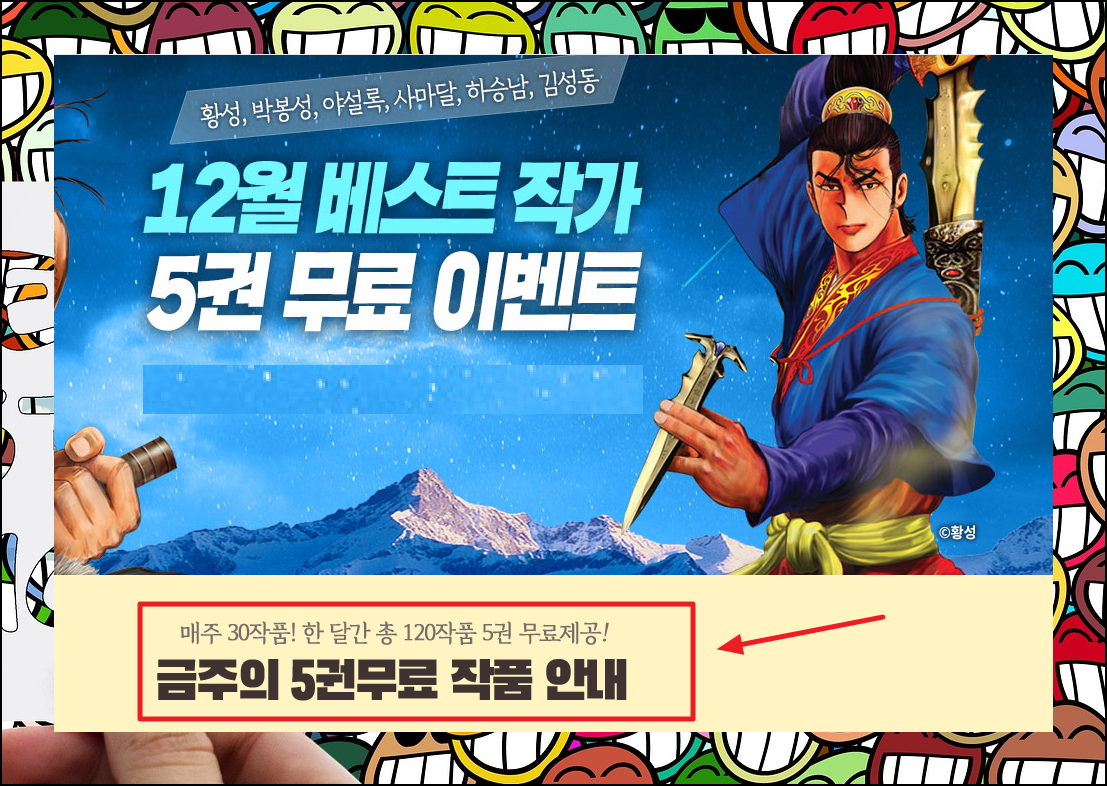 이번 달에는 총 120작품에 대하여 5권을 무료로 볼 수 있다고 하는데요. 국내 유명 작가의 작품들이 많습니다.