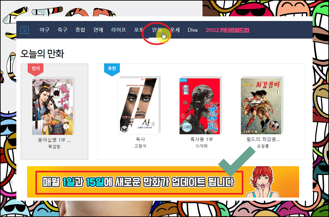 사이트에 접속하면 메뉴에서 [만화]를 클릭해 주세요. 그럼 여러 가지 볼 수 있는 만화책 목록이 나타나는데요. 안내 문구에 나와 있듯이 매월 1일과 15일에 새로운 만화책이 업데이트 됩니다. 요즘 인기 있는 작품으로는 묵검향 작가의 용아십병, 고행석의 독사, 이재학의 흑사풍, 오일룡의 필드의 최강콤비가 있네요.